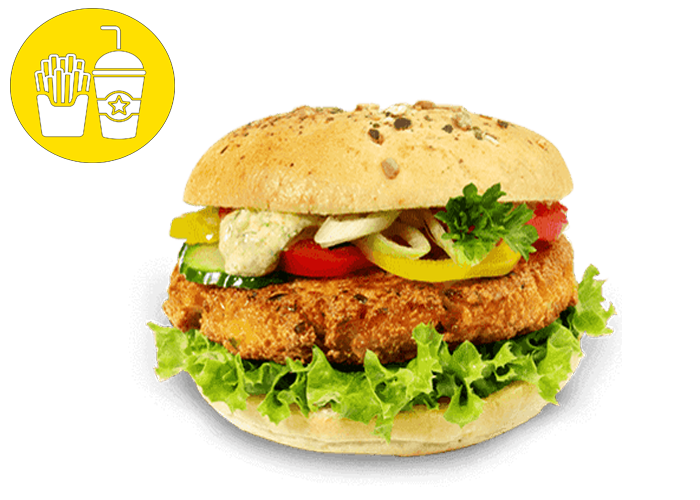 Steak 180g, poulet pané, fromage, tomates, salade, sauce burger.